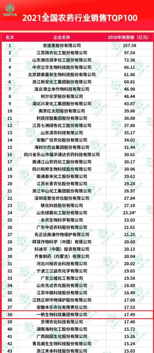 一帆生物荣列第38强! 2021全国农药行业销售TOP100发布 |