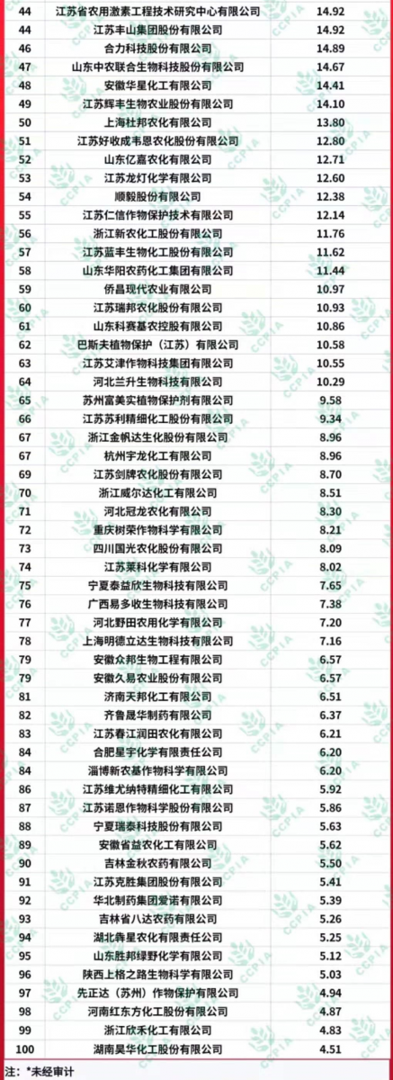 附2021全国农药行业销售TOP100完整榜单如下: