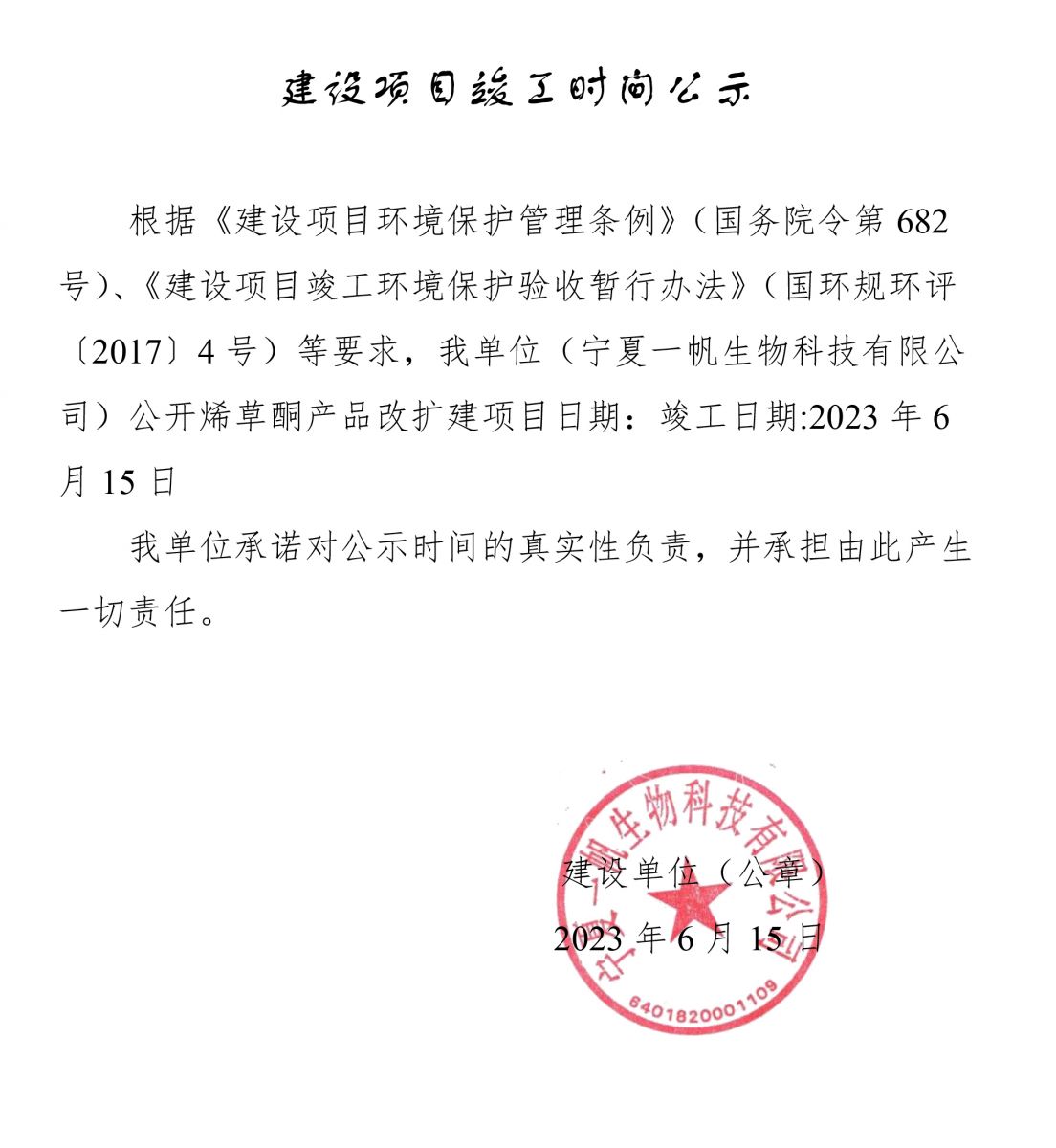 宁夏一帆建设项目竣工时间公示