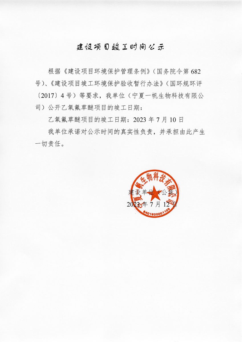 宁夏一帆乙氧氟草醚项目竣工时间公示