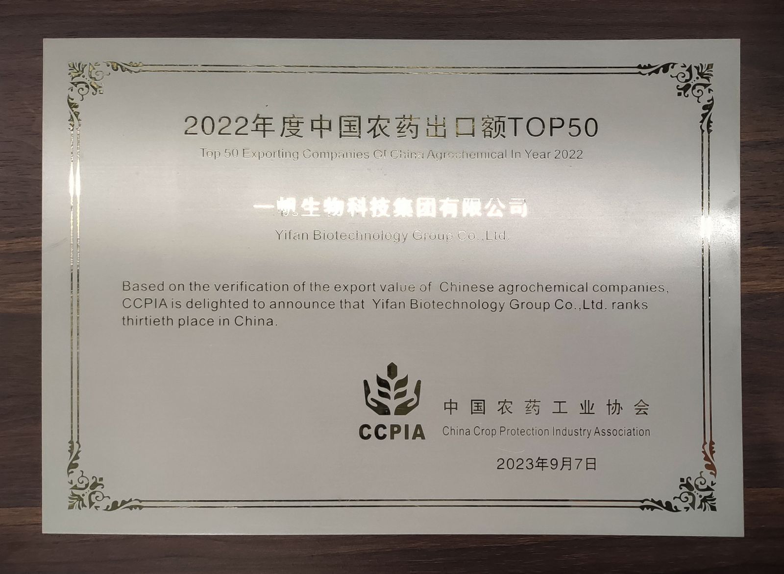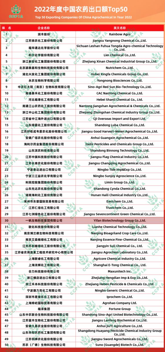 祝贺一帆荣登2022年度中国农药出口额TOP50榜单 |
