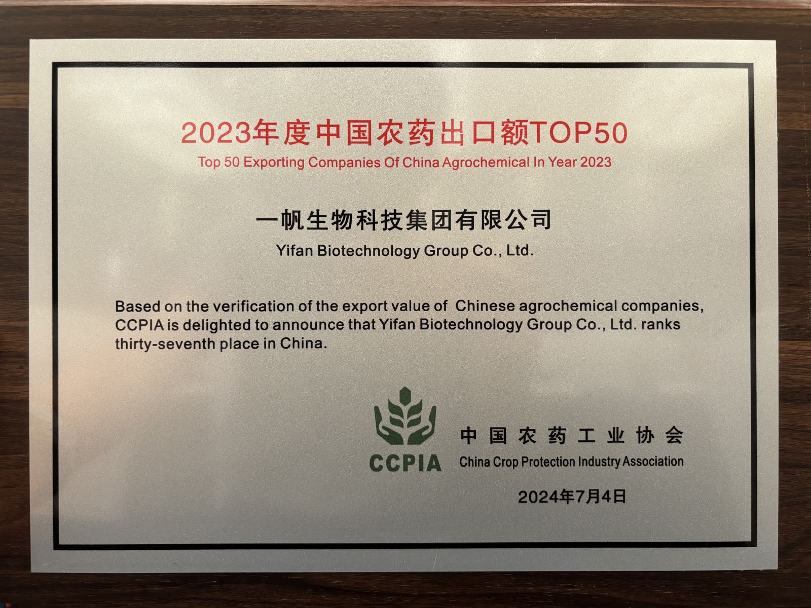 2024年7月4日,第十一届中国植物保护产品国际贸易发展论坛在南京召开。论坛上, 中国农药工业协会发布2023年度“中国农药出口额Top50”,一帆生物荣登榜单,位列第37名。