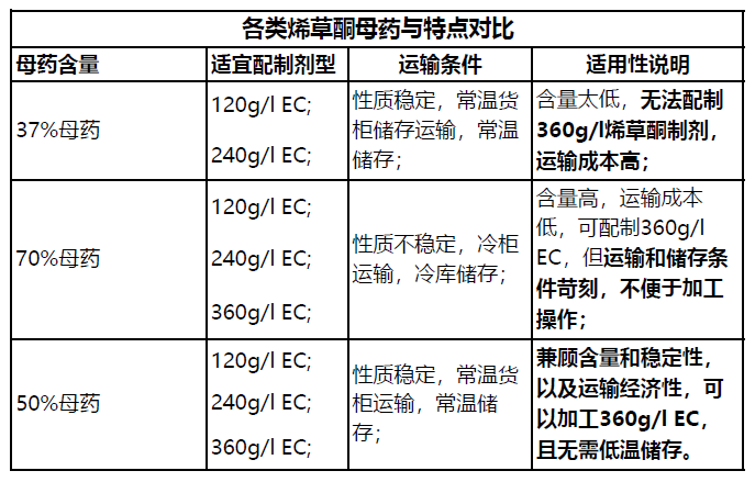 烯草酮(Clethodim)由于其产品化学特性,原药表现出显著的不稳定性,易降解。目前市场上常见的母药含量为37%和70%。尽管37%含量的母药性质较为稳定,但其无法满足高浓度制剂的配置需求。而70%含量的母药虽然浓度较高,但其稳定性较差,对运输和储存条件要求较为严格,特别是需要冷链运输和仓储,这将导致企业物流成本的显著增加。