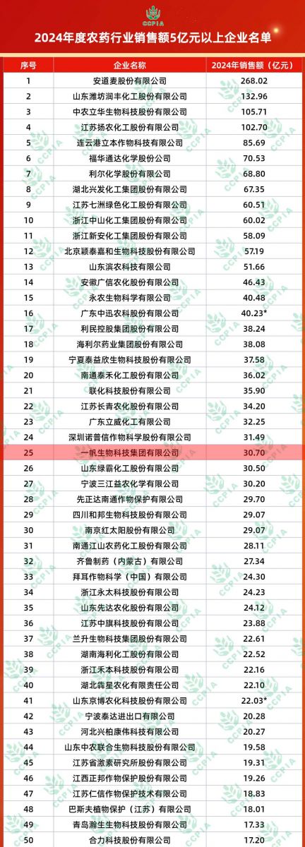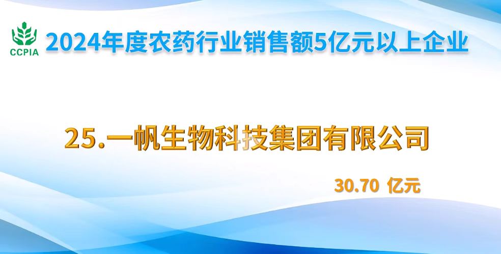 喜报!一帆荣获2024年度农药行业销售额企业名单第25名! |